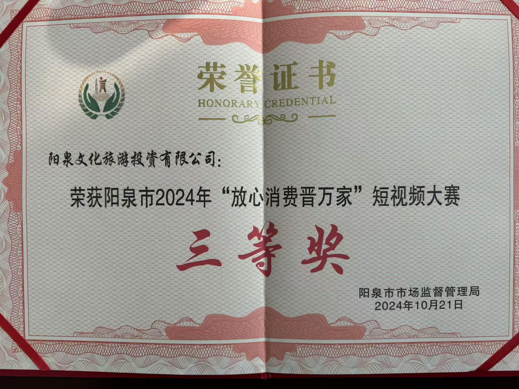 2024年10月21日,阳泉市市场监督管理局授予:荣获阳泉市2024年“放心消费晋万家”短视频大赛 三等奖